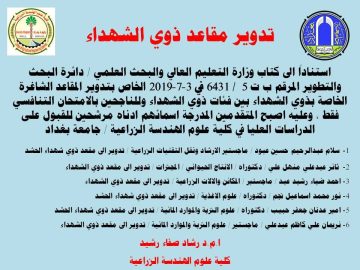 شهدت كلية علوم الهندسة الزراعية جامعة بغداد مناقشة رسالة الماجستير الموسومة(دور الإستغلال الزراعي في تقييم الأراضي المختلفة الأستعمالات لبعض أراضي الترب الصحراوية في محافظة كربلاء)، للطالبة أمنه علي سبع من قسم مكافحة التصحر .