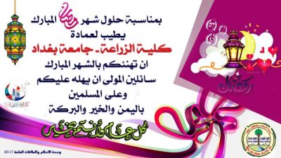 شهدت كلية علوم الهندسة الزراعية في جامعة بغداد مناقشة اطروحة الدكتوراه الموسومة ( دور الرش بالميلاتونين والجبرلين في نمو وحاصل نبات الريحان وبعض المركبات الفعالة طبياً تحت ظروف الإجهاد المائي ) للطالبة هاله فيصل خزعل من قسم البستنة وهندسة الحدائق