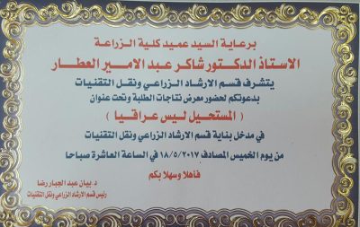 شهدت كلية علوم الهندسة الزراعية في جامعة بغداد مناقشة اطروحة الدكتوراه الموسومة ( دور الرش بالميلاتونين والجبرلين في نمو وحاصل نبات الريحان وبعض المركبات الفعالة طبياً تحت ظروف الإجهاد المائي ) للطالبة هاله فيصل خزعل من قسم البستنة وهندسة الحدائق