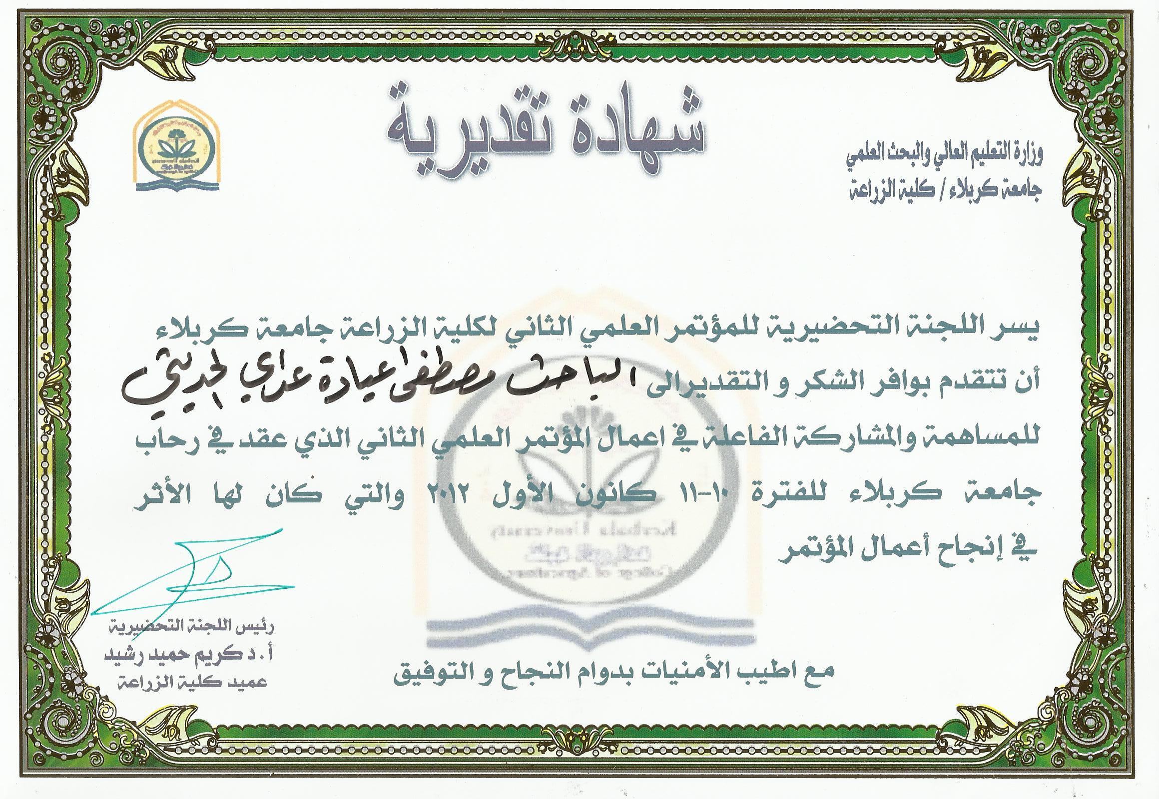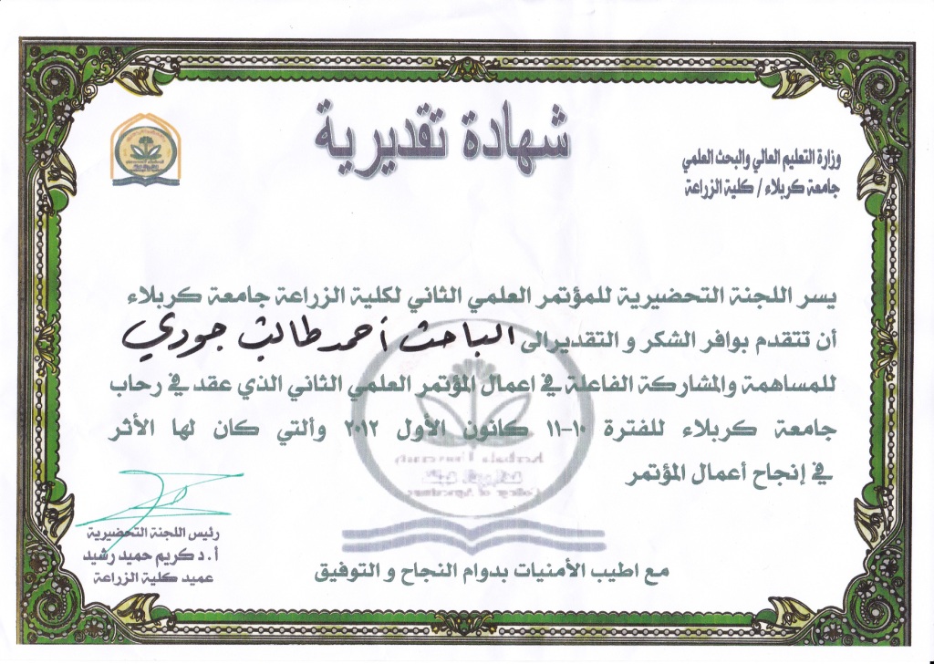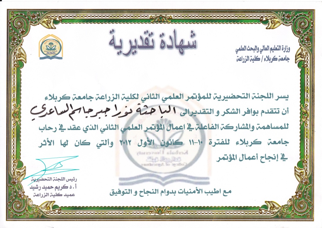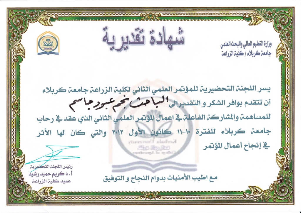 بحضور السيد عميد كلية الزراعة –جامعة بغداد أ.د.حمزة كاظم الزبيدي ورئيس قسم البستنة وهندسة الحدائق أ.م.د. كاظم ديلي حسن شارك كوكبة من اساتذة وتدريسيي قسم البستنة بالقاء ونشر ثمانية ابحاث علمية شملت محاور بستنية عدة منها زراعة الانسجة النباتية والفاكهة المستديمة والمتساقطة ،وحصل السادة المشاركين على شهادات تقديرية من رئيس اللجنة التحضيرية للمؤتمر السيد عميد كلية الزراعة جامعة كربلاء أ.د. كريم رشيد.