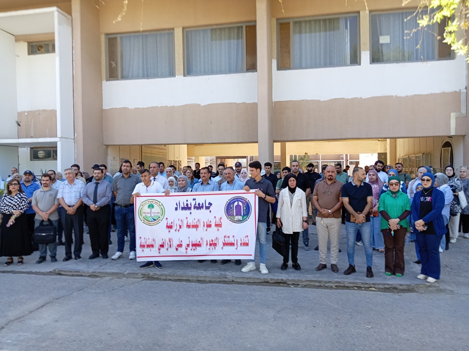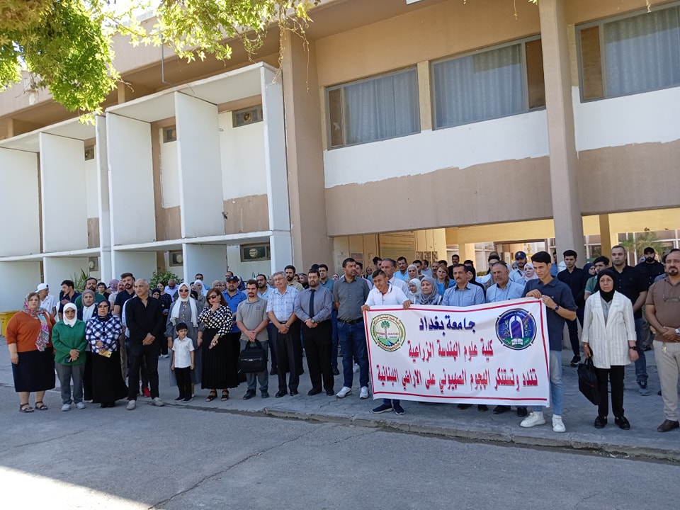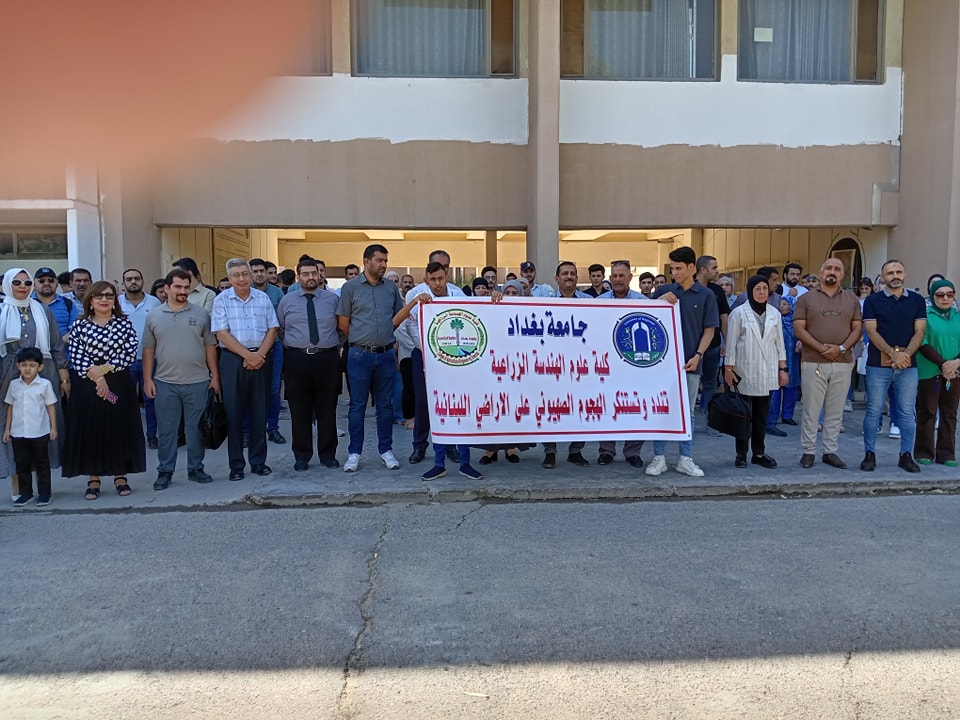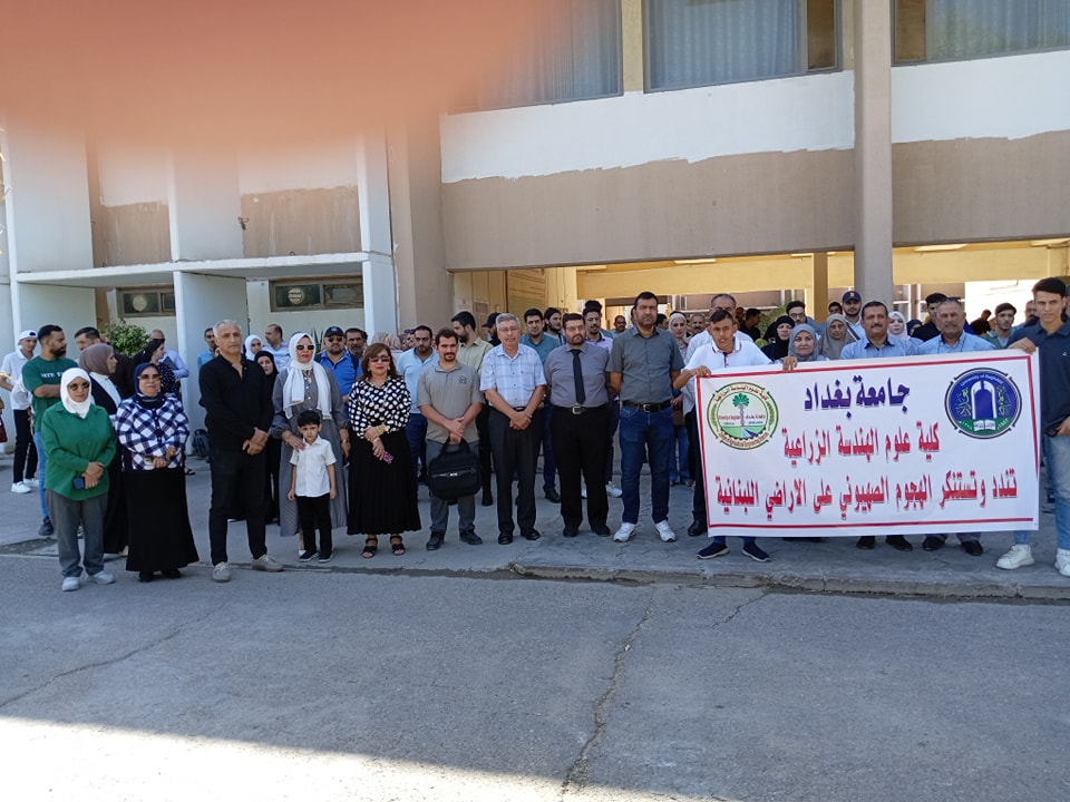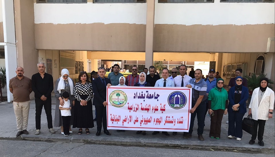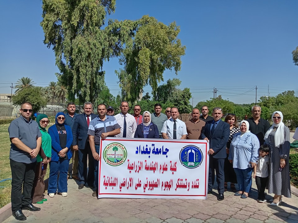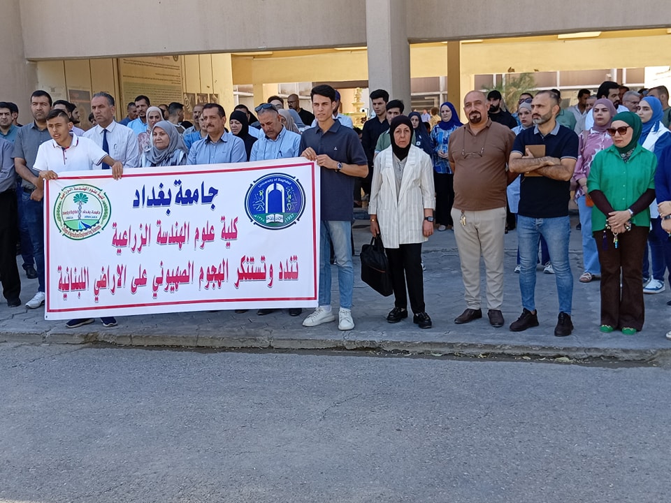 نظمت كلية علوم الهندسة الزراعية جامعة بغداد وقفة تضامنية مع الشعب اللبناني الشقيق احتجاجا على العدوان الصهيوني الغاشم حيث القت الاستاذ الدكتورة اميرة محمد صالح عميد الكلية كلمة تناولت فيها اشد عبارات الاستنكار لتمادي العدو الصهيوني في العدوان على الاراضي اللبنانية ثم القى معاون العميد لشؤون الطلبة الاستاذ الدكتور اسامة كاظم جبارة .