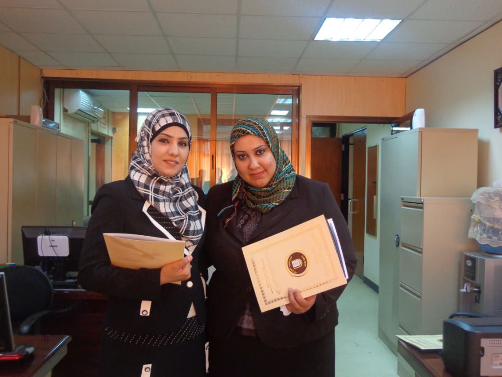 حصلت التدريسيتان ميادة طارق علوان واسيلمحمد حسن هاتف على كتاب شكر وتقدير من السيد مساعد رئيس جامعة بغداد للشؤون العلمية نظرا للجهود المتميزة والالتزام العالي والتفاعل مع المحاضرات والفعاليات وتقديم محاضرات انموذجية مصغرة،التي قدمتاها بدورةالتاهيل التربوي 171 ودورة اللغة العربية 145 للتدريسيين الجدد التي نظمها مركزالتطوير والتعليم المستمر في قاعة المركز بالجادرية للمدة من 13 / 1 / 2013لغاية 14 / 2 / 2013.