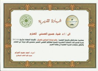 شارك ا.د.ضياء حسن الحسني في الندوة المعنونة ((واقع صناعة صناعة الدواجن في العراق)) التي نظمتها كلية الطب البيطري ,جامعة الكوفة بالتعاون مع جمعية علوم الدواجن العراقية والاتحاد العراقي لمنتجي الدواجن في 442013 .على رحاب قاعة جابر ابن حيان ,كلية الطب البيط