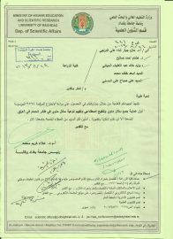 حصول الاستاذ الدكتور مهدي ابراهيم التميمي على كتاب شكر وتقدير من معالي وزير التعليم العالي والبحث العلمي