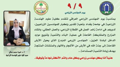 تسلمت الاستاذ الدكتورة أميرة محمد صالح عميد كلية علوم الهندسة الزراعية جامعة بغداد درع الابداع الارشادي وشهادة تقديرية من الدكتور مثنى فلحي حمود مسؤول وحدة الارشاد النفسي الجامعي بحضور الاستاذ الدكتور محمد شاكر الخشالي وذلك بعد حصول وحدة الارشاد النفسي في الكلية على المركز الأول على مستوى وحدات الارشاد النفسي الجامعي في تشكيلات جامعة بغداد .