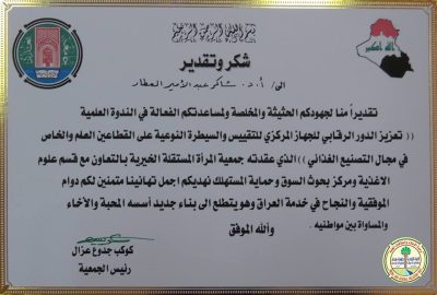 كتاب شكر وتقدير لعميد كلية الزراعة