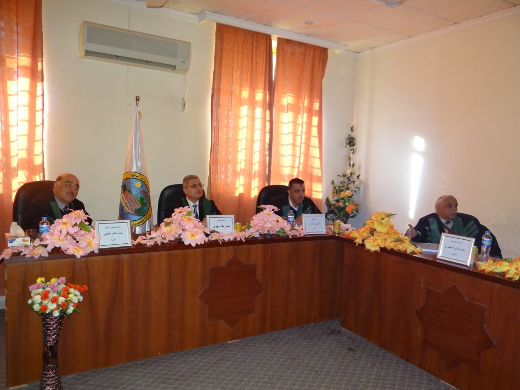 بناءاً على توصية قسم علوم التربة والموارد المائية واستناداً الى موافقة مجلس الكلية بجلسته الثالثة المنعقدة في 22/10/2013 تمت مناقشة طالب الماجستير (حسين عبد علي عيسى) في القسم المذكور لموضوع رسالته الموسوم ” تحديد حالة التغير في معامل نوعية الترب ومدى ملائمتها للإنتاج الزراعي” وذلك في الساعة التاسعة والنصف من صباح يوم الخميس المصادف 26/12/2013 في قاعة الرازي في قسم علوم التربة والموارد المائية ، وقد تم تقويم الرسالة لغوياً من قبل الدكتورة شذى جاسم هادي/مدرس/الجامعة العراقية /كلية الاعلام.وعلمياً من قبل الدكتور عبد الحليم علي سليمان/استاذ مساعد/مسح وتصنيف التربة /قسم علوم التربة والموارد المائية /كلية الزراعة /جامعة بغداد. اما اعضاء المناقشة فهم كالاتي:-