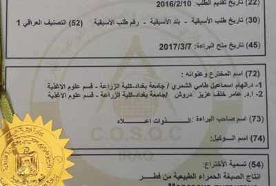 حصل كل من أ.م.د.الهام اسماعيل طامي و أ.د. عامر خلف عزيز على براءة اختراع من وزارة التخطيط / الجهاز المركزي للتقييس والسيطرة النوعية