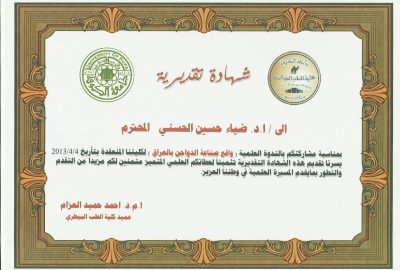 منح ا.د.ضياء حسن الحسني درع معهد الهندسة الوراثية والتقنات الاحيائية للدراسات العليا في جامعة بغداد خلال الاحتفالية التي نظمها المعهد يوم 20/3/2013 .وذلك تقديراً لجهوده المتميزة.
